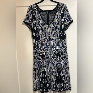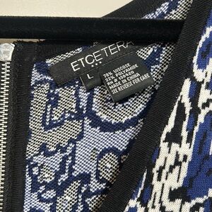 Etcetera Black and White V-Neck Knit Dress. Short Sleeve fit and flare with a back exposed zipper. Size Large. Dry clean. One tiny spot-see image.