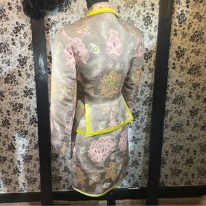 Stylish floral blazer and skirt set featuring neon yellow accents. Perfect for a bold fashion statement.Like New