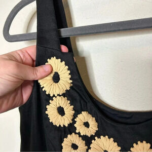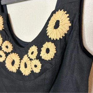 Beautiful fully lined sleeveless dress. Outer layer is a blend of linen and rayon. If you need a little black dress but it's warmer weather, this is a great pick. Cream colored floral detailing along the top. In very good used condition.
