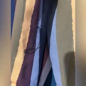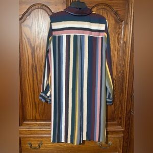 Elegant long sleeve dress with bold stripes. Features navy, pink, and cream hues. Ideal for a sophisticated look.