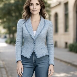 Elevate your style with this chic blue tweed jacket. Perfect for any occasion, it offers a sophisticated look with its elegant design.