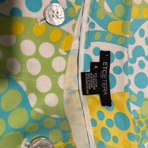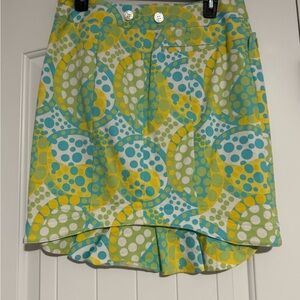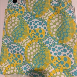 Vibrant pencil skirt with a playful dot pattern. Features blue, yellow, and green hues. Perfect for a stylish look.