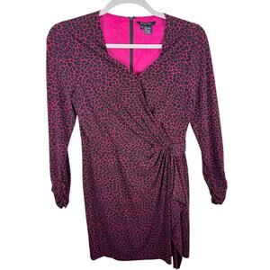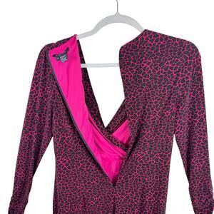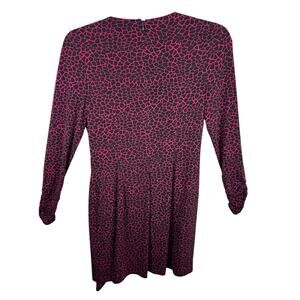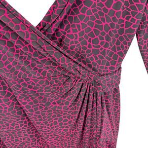 Excellent preowned condition. Pink & black patterned faux wrap long ruched sleeve V-Neck stretchy knee length dress. Has modesty snap on chest. Zips up back. Polyester material. Approx. measurements: Shoulder to hem 38", pit to pit 22", sleeve from neck to sleeve hem 32", waist across 16". Size 14.