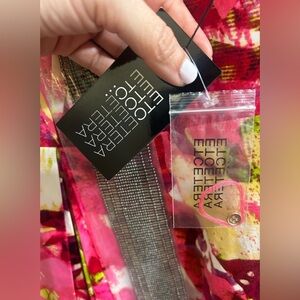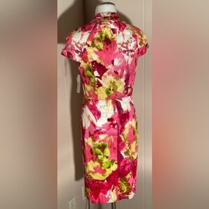 Etcetera Pink Hibiscus Floral Cap Sleeve Dress. NWT. Size 12. Pleated neckline that continues to the front of dress. Back hidden zipper with an ivory detached lining. Cap sleeves have pretty gold button details. Also comes with matching extra threading. Cotton spandex. Mom never wore. Great for a wedding. Purchased at a boutique in Scarsdale,NY.