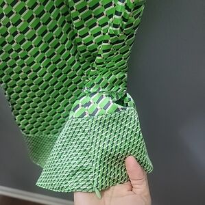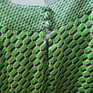 The Etcetera Sleeveless Blouse is a stylish and versatile top perfect for a career retro look. Made from a luxurious silk blend, this classic fit blouse features a geometric pattern in vibrant multicolors. The sleeveless design, crew neck, and side zip closure make it suitable for various occasions including travel, casual outings, and business meetings. Ideal for year-round wear, this retro-themed blouse is a wardrobe staple that adds a touch of elegance to any outfit. This is in excellent preloved condition.