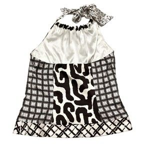 Etcetera Women’s Silk Black&White Side Zip Drape Tie Backless Halter Top SZ 10