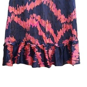 Tie-dye 100% silk pleated ruffle Midi skirt bold orange and pink abstract lined print on deep rich brown by Etcetera.