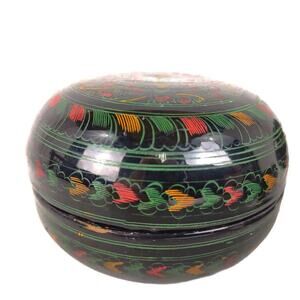 I purchased this nesting box set while in Australia. They are wood with black lacquer and hand etched Folk Art designs in red, green and yellow. From my limited research, they appear to be Asian, most likely Burmese Betel Kun-It boxes. They are round with a flat surface on the tops - there doesn't appear to be a designated top or bottom as they are the same on both sides. The largest bowl box is 2-7/8" tall, 4" in diameter. The pieces inside are gradually smaller.