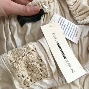 Cinched waist, and crochet details. Can be worn on or off shoulder.