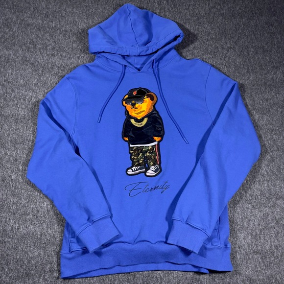 Keywords: blue hoodie, graphic hoodie, teddy bear hoodie, hip hop hoodie, mens hoodie, eternity hoodie, streetwear hoodie, casual hoodie, large hoodie, menswear, urban fashion, embroidered hoodie