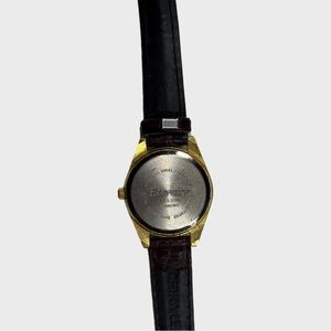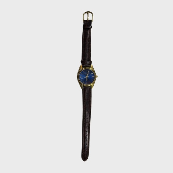 Stylish watch featuring a blue face and gold accents. Comes with a brown leather strap.