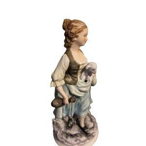 This exquisite Ethan Allen porcelain figurine set features a shepherd and a shepherdess, each gently cradling a lamb. Ideal for collectors or as a sophisticated decorative piece for a home or office. The craftsmanship reflects delicate details and a serene pastoral theme.