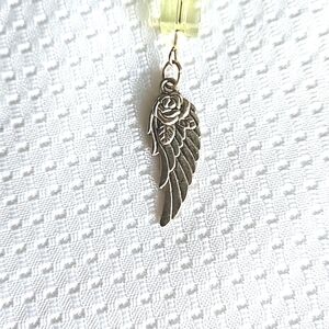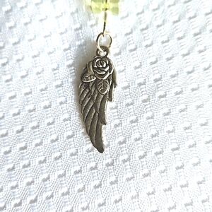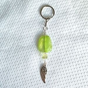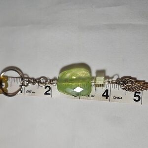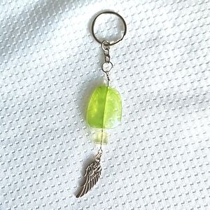 Handmade by me in a smoke-free home. This item is a beaded keychain featuring an Angel wing charm and yellow-green-toned beads and measures approximately 5.25 inches long.