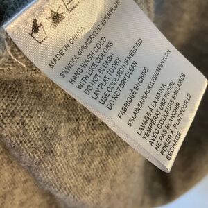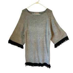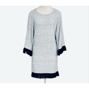 Ethereal Papercrane, an anthro brand, grey sweaterdress. Size Small. Tunic straight cut. Black fringe on hem and wrists. Boatneck. 5% wool. Excellent condition. Casual, workwear, church. Flat lay 35.5” L, 19” P-P