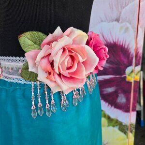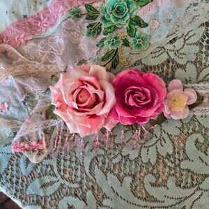One-of-a-Kind Coquette Waist Sash. Meet your new favorite style secret! This dreamy handmade belt combines genuine vintage lace with darling millinery flowers and sparkling plastic beaded fringe. It's the ultimate accessory to complete your romantic cottagecore or coquette girl aesthetic. Use it to cinch your waist, loop it over a simple tee and jeans, or tie it as a gorgeous, eye-catching vintage headband.