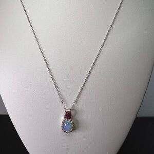 Genuine Welo Ethiopian opal with Niassa ruby and white zircon accent stones. Set in platinum over sterling silver. Rubies have been fissure filled. Chain measures 18 inches in length. 1.75 ctw. 925 Djoy