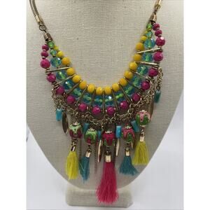 Ethnic Boho Bead Fabric Statement Necklace Fringe Tassel Earrings Gold Tone