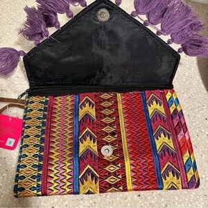 Large clutch purse 10” x 7 1/2” with a suede wristlet 6 1/2”. Flap opens to zippered compartment, a dividing pocket, silver magnet closure. Cotton materials and synthetic lining for interior.