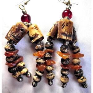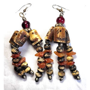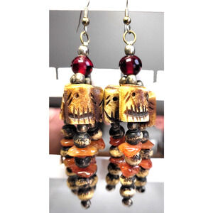 Ethnic Earrings Native Carved Skull Mala Tribal Agate Chips Dangle Boho Goth 4"