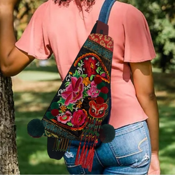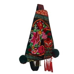 This handmade sling bag is perfect for those who appreciate ethnic embroidery and unique accents. The black canvas exterior features a beautiful floral pattern with tassels, pom poms, and beads that add a touch of bohemian style. The bag is lightweight and lined with blue fabric, making it perfect for everyday use.