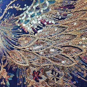 -Peacock Motif: Features a majestic, sparkling sequin peacock (or Phoenix) design in dazzling gold and multicolor.