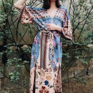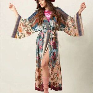 Ethnic Tribal Pattern Boho Belted Kimono, Long Wide Sleeve Loose Baggy Cover Up