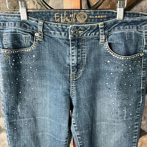 Touches of bling make these a wonderful wardrobe add on. Classic 5 pocket styling and front zip.