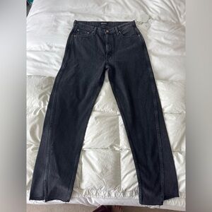 A classic slim straight leg jean with a high rise. Fit is slim through the leg. This lofty, medium weight non-stretch denim has an authentic vintage character and an incredibly soft hand, finished in a clean black wash with natural wear.