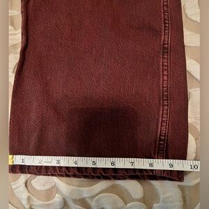 Belt is missing but can add your own black leather belt or other color/material belt. Beautiful red denim with hidden button closure. See pictures for measurements.