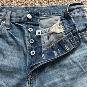 Trendy wide leg ripped jeans with a distressed look. Comfortable. Button up.