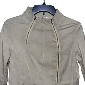 Rare and chic Etichetta Toscana jacket, crafted in Italy! This beige jacket features an asymmetric full zip design and a flattering stretch fit. Perfect for adding a touch of sophistication to any outfit. You'll love the unique details and comfortable feel of this designer piece!