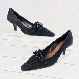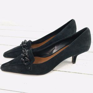 Etienne Aigner Size 6 M Black Suede Pointy Toe Heels E-Michelle Chain