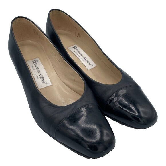 Classic Etienne Aigner black leather cap toe pumps. These elegant heels feature a sleek silhouette with a contrasting glossy cap toe and a comfortable block heel. Perfect for adding a polished touch to your work attire or a sophisticated evening out.