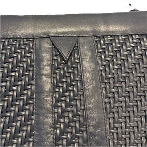 Chic black woven design. Stylish crossbody strap. Iconic brand emblem.