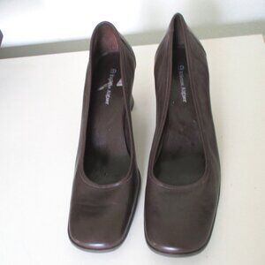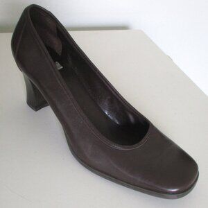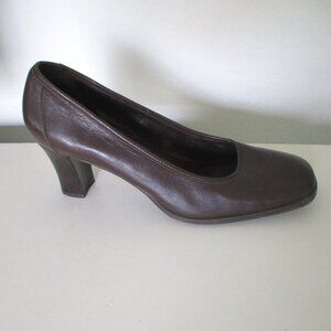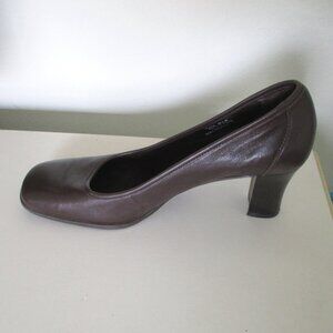 Etienne Aigner "Bloom" Womens Brown Leather Pump w/2.75" Block Heel. Size 9.5M. Made in Brazil. Previously owned but barely used, leather uppers & interiors are in excellent condition, the ribbed rubber soles are pristine, while only the heels, which are still flat & true, reveal the slightest wear.