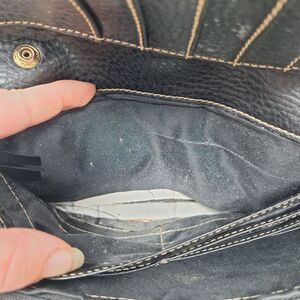 This Etienne Aigner Brown and Black Canvas and Leather Snap Wallet is in good used condition, there is a small mark on one of the card slots and the billfold pocket has a rip on the inside. This preppy accordian wallet has a snap closure and is made of brown signature jacquard canvas with leather accents. This classic wallet has a back slip pocket and is perfect for everyday casual use.