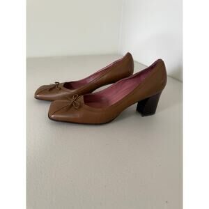 Etienne Aigner Brown Tan Leather Square Toe Bow Low Block Heels Pumps 8.5 8 1/2 Academia