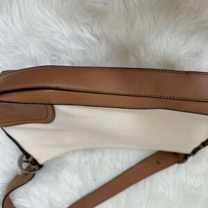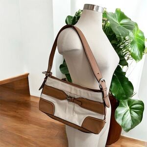 Vintage Etienne Aigner off-white cream, canvas and tan leather shoulder/baguette bag purse.