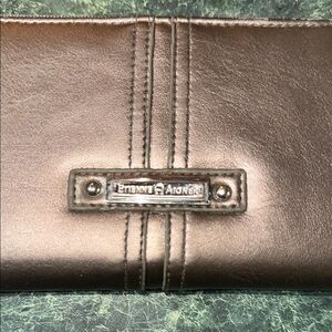Stylish Etienne Aigner wallet. Metallic finish. Sleek design. Zip around.