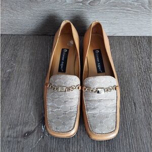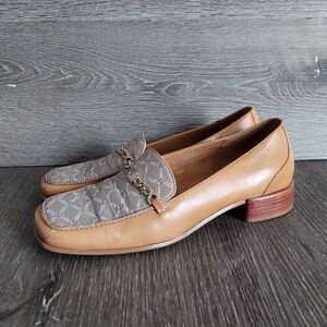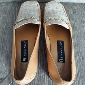 Vintage designer Etienne Aigner camel brown leather and signature textile loafers with modest low heels and gold plated A chains across the tops.