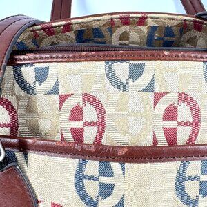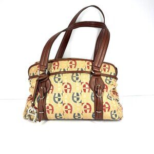 Classic Etienne Aigner shoulder tote with allover logo canvas and brown faux leather trim. Dual top handles, silver-tone hardware, and zip-top closure.