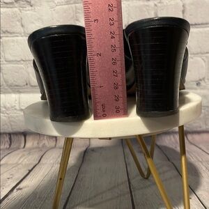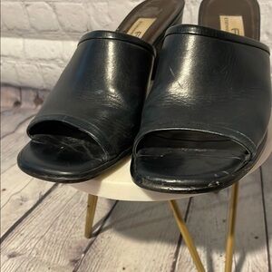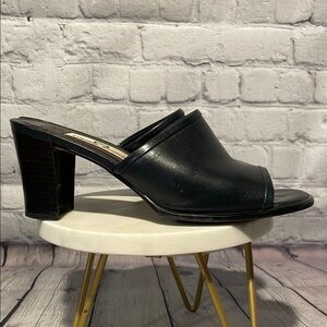 These Etienne Aigner mules feature a sleek black leather design with a medium block heel, perfect for both casual and semi-formal occasions. The slip-on style and open toe offer a minimalist aesthetic, making them a versatile addition to any wardrobe.