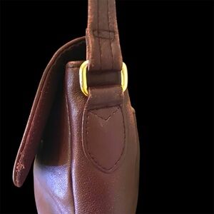 Gorgeous oxblood leather by Etienne Aigner! Beautiful and classic burgundy color, this leather has been cleaned and conditioned and ready for you to carry with all outfits. It has three compartments on the inside. The middle compartment is a zip up pocket. It has gold hardware that is still shiny. This brand is making a comeback and you should get one now before it’s too late. Measurements are approximate. 100% authentic.