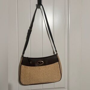 Etienne Aigner Signature Oxblood Leather and Tan Woven fabric bag. Excellent condition. Zippered center section and 2 open large sections. Front and back outer pockets. Lots of room and space for organization. Should strap is let out to its full length and the drop is 15”.