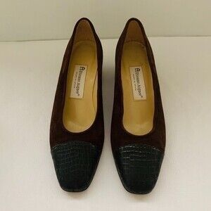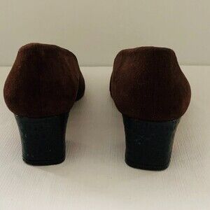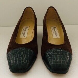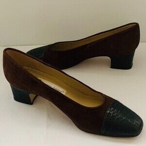 Etienne Aigner Suede Pumps with Snake Skin print Cap Toe and heel Size 8.5, Made in Spain. Very dark brown suede/leather, cap toe and heel are black. Excellent condition! Thank you for checking out my closet!