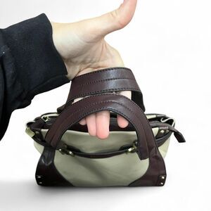 tote bag, two-tone, leather trim, buckle straps, gold hardware, canvas material, structured design, vintage accessory, fall neutral, preppy style