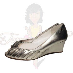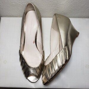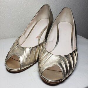 Etienne Aigner Uma Gold Peep Toe Slip-On Leather Upper Wedges Sz 9.5M