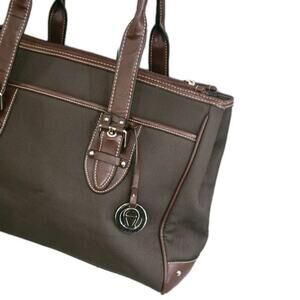 Elegant design with sturdy dual handles and signature Etienne Aigner charm.