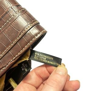 Keywords: Etienne Aigner, tan tote, women's handbag, spacious tote, crocodile print, summer bag, resort style, casual tote, pre-owned handbag, stylish tote, versatile bag, dual straps, secure zip closure, branded lining, faux leather straps.