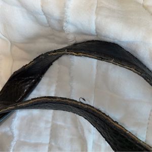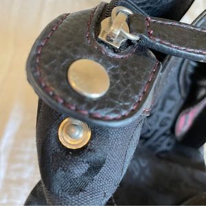 This was my daughter’s purse and has been well “cared for.” It has some wear on the handle edges at the point where you would hold it (as pictured) but is in excellent condition otherwise and has a beautiful burgundy accent on latch and at each corner. See measurements in photos.